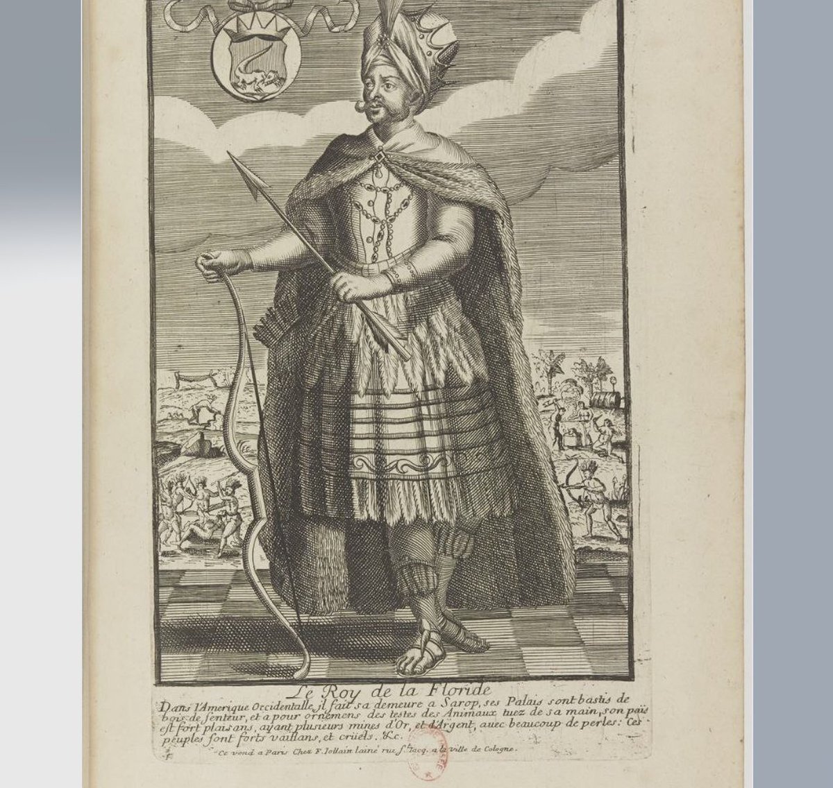 フロリダの王。 なんてモジャモジャの口髭だ! 「彼の西洋風のテントの住まいでは、彼の宮殿は香りのする木材で支えられ、殺した獲物の毛皮で飾られている。彼の国は金と銀の鉱山が多く、とても魅力的な土地であり、彼の人々は非常に勇敢で残忍である。」 x.com/history_hacked…